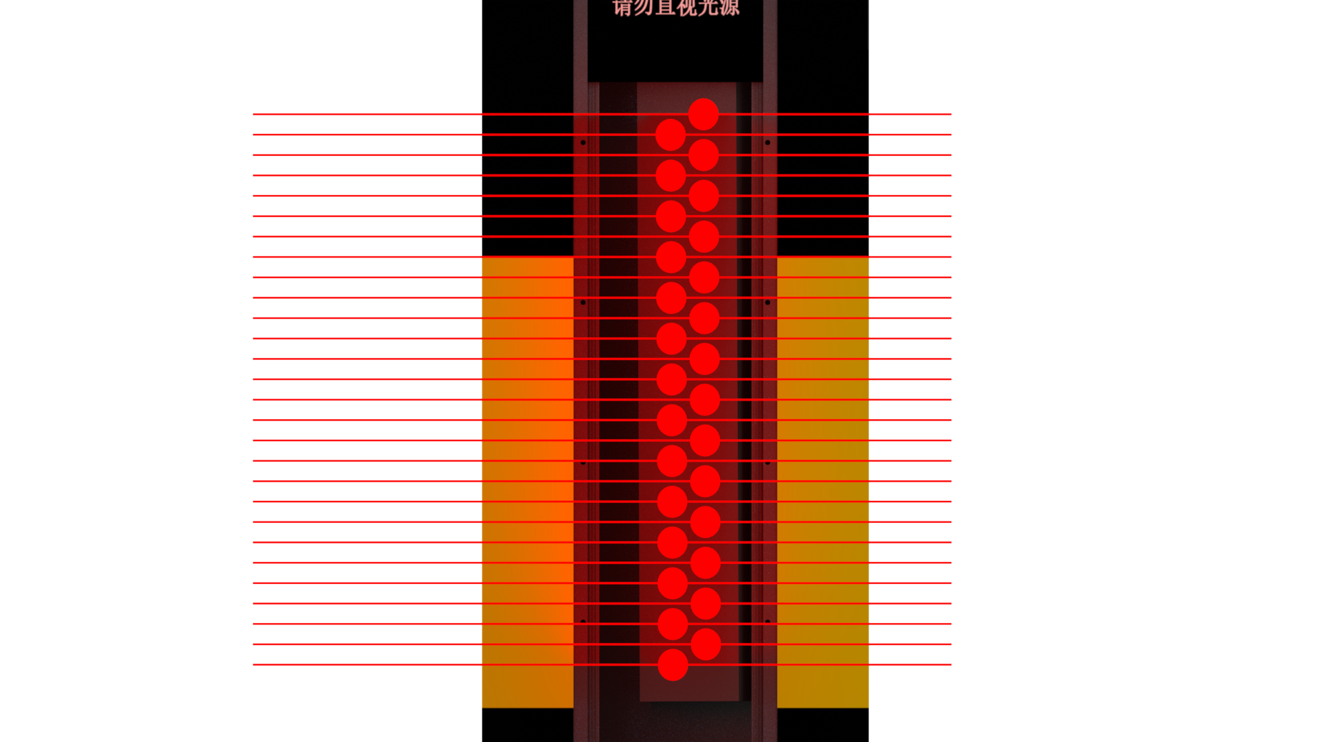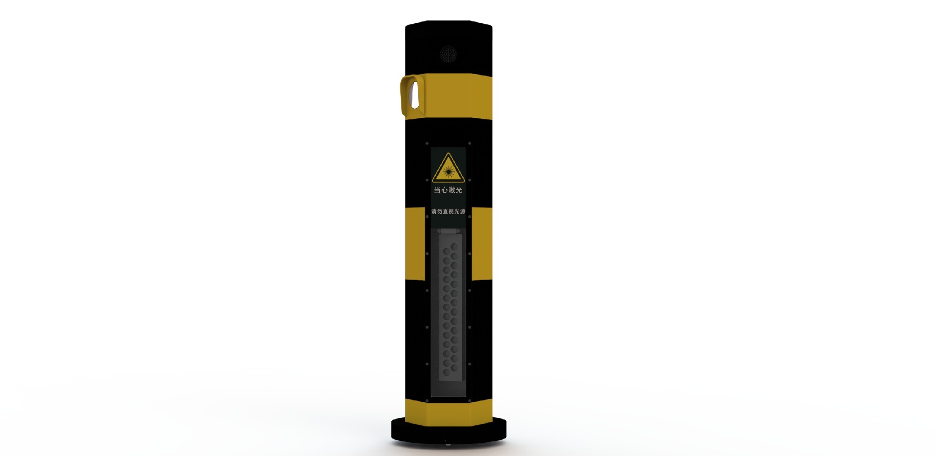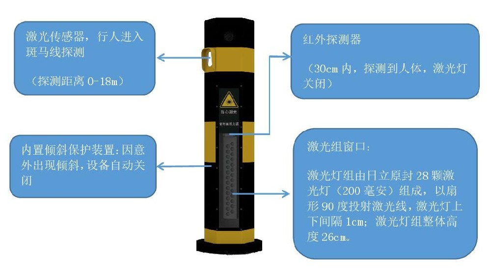 在與廠家技術(shù)人員溝通得知,該機采用激光+紅外的雙感知方案,激光燈組由日立原封28顆激光燈(200毫安)組成,以扇形90度投射激光線,激光燈上下間隔1CM,激光燈組整體高度為26CM,激光不會直射人眼。行人感應(yīng)器有效探測范圍20米。還具有傾斜保護和行人近距離保護功能,當(dāng)激光樁意外傾斜或有行人靠近激光燈范圍30cm以內(nèi)時,激光燈關(guān)閉,起到一個很好的保護行人的作用。