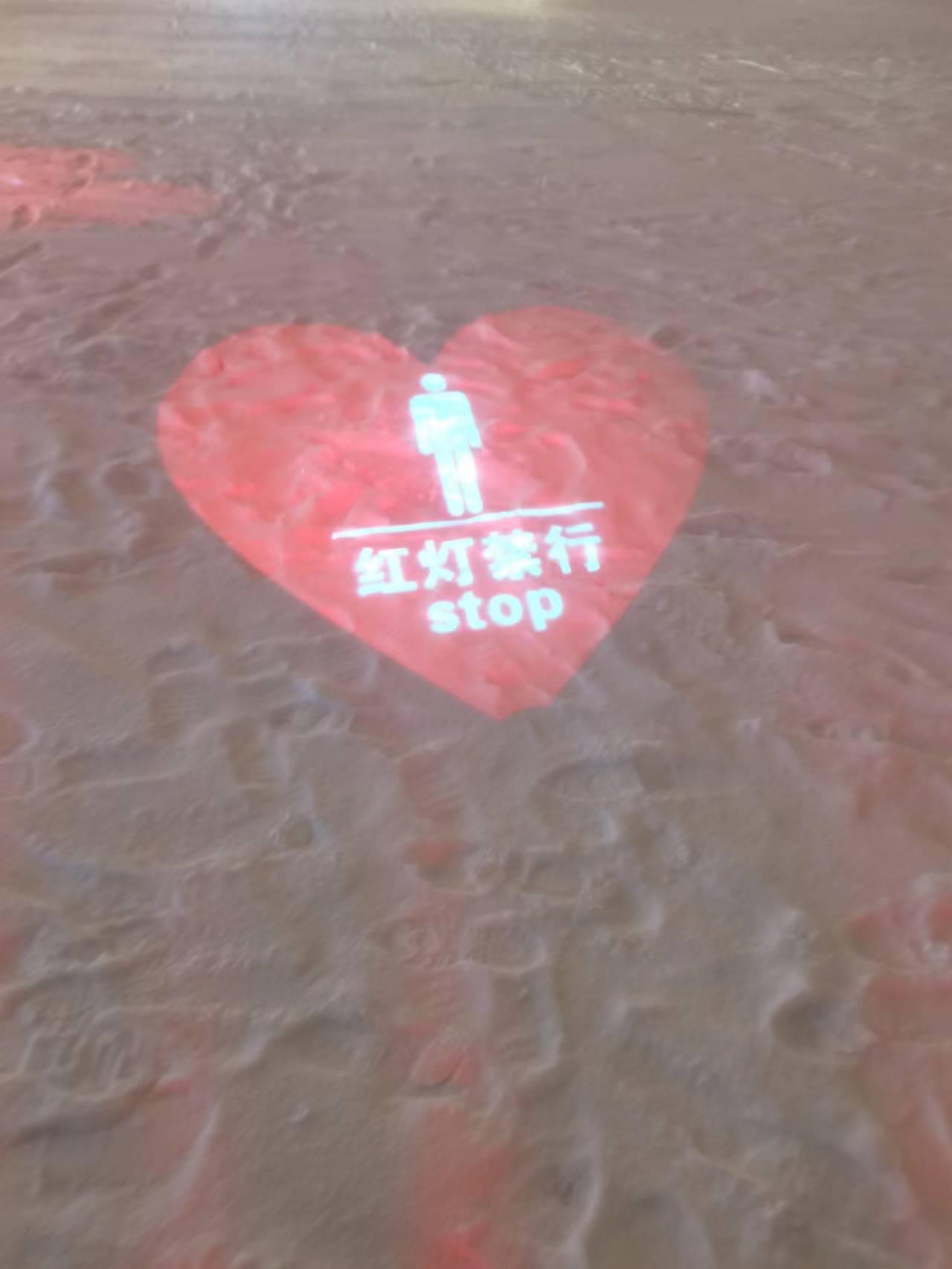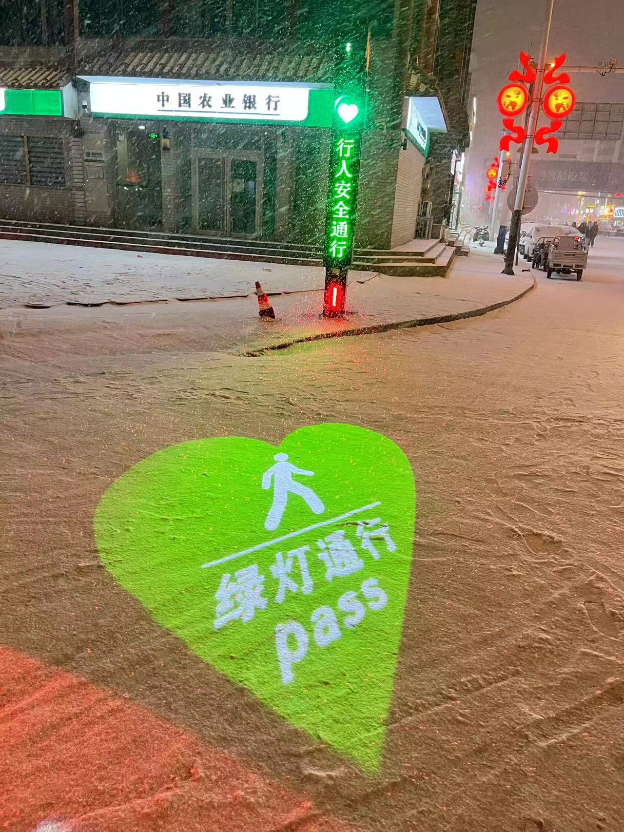 在愛心信號燈綠燈工作時,設備投射28條紅色激光線到過街行人小腿處,形成紅色區域投影,提示機動車駕駛員遠距離得到紅色警示和發現行人動態,并及時做出反應;同時紅色光線引起行人注意,能夠警醒“低頭族”注意過街安全,從而減少交通意外的發生